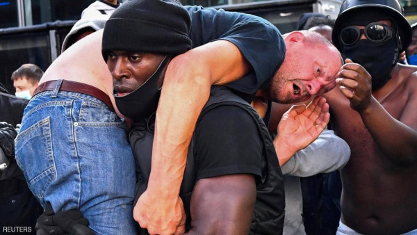كشفت صحيفة بريطانية تفاصيل جديدة مثيرة، عن صورة لرجل من أصول إفريقية يحمل آخر أبيض، أصيب خلال مظاهرات لحركة "حياة السود مهمة" في لندن.