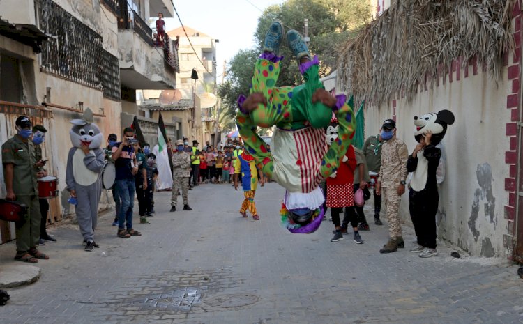 مهرجون يقدمون عروضاً ترفيهية للأطفال المعزولين بمنازلهم، خلال فترة حظر التجول في دير البلح وسط قطاع غزة.