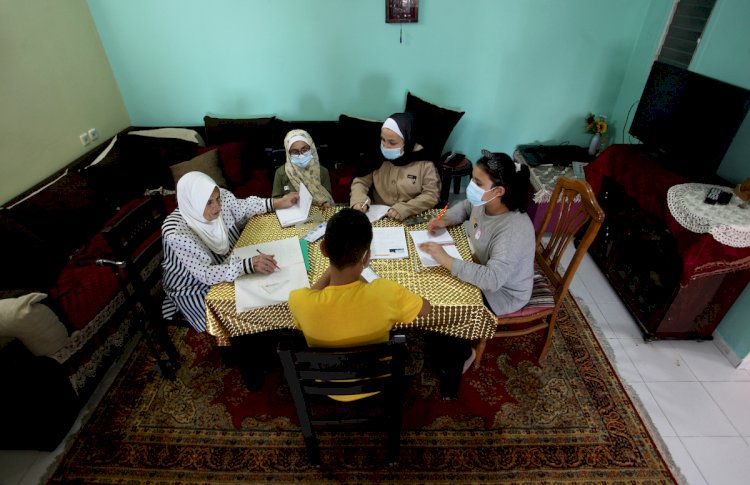 المدرسة إكرام الأسطل (80 عاما) تدرس الطلبة في منزلها بمدينة غزة كإجراء وقائي وسط تفشي فيروس كورونا