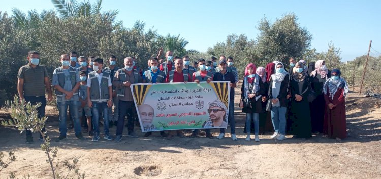 نظم مجلس العمال بحركة فتح ساحة غزة محافظة الشمال يوماً تطوعياً لجني الزيتون في منطقة العامودي غرب محافظة الشمال "