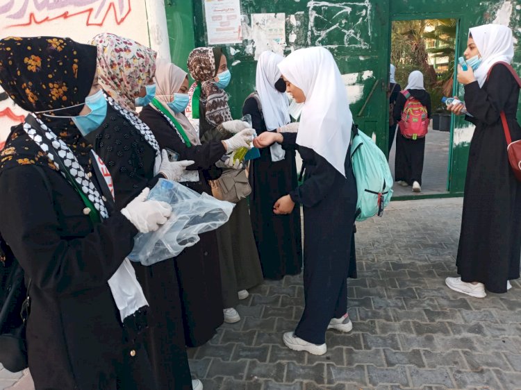 وقامت ماجدات الشبيبة الفتحاوية بتوزيع الكمامات وأدوات التعقيم على الطالبات أمام أبواب المدارس.