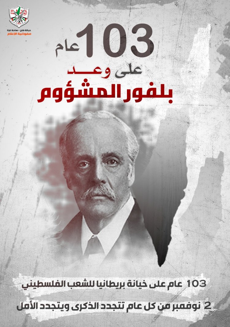 تصادف غدا الاثنين، الثاني من تشرين الثاني، الذكرى الـ103 لصدور اعلان بلفور المشؤوم، الذي منحت بموجبه بريطانيا الحق لليهود في إقامة وطن قومي لهم في فلسطين.