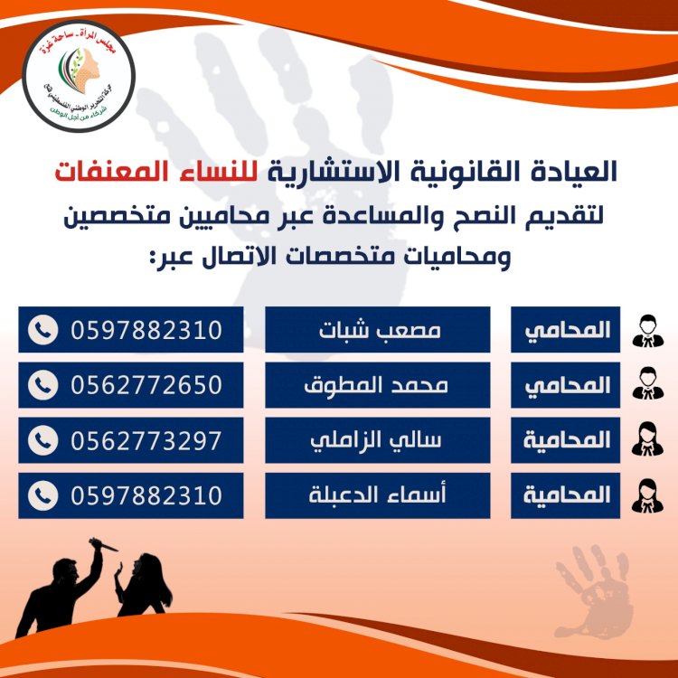 أطلق مجلس المرأة في حركة فتح ساحة غزة بالتعاون مع لجنة المكاتب الحركية للمحاميين مبادرة" العيادة القانونية الاستشارية " للنساء المعنفات ،ضمن حملة ال16يوم لمناهضة العنف ضد المرأة ، عبر مجموعة من المحاميين المتخصصين والمحاميات المتخصصات .