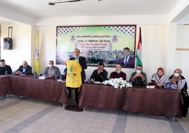 نظمت لجنة التعبئة الفكرية بحركة فتح في محافظة خانيونس اليوم لقاءً ثقافياً بمناسبة الذكرى " 56 " لانطلاقة الحركة ٫ بمشاركة أعضاء مجلس الساحة وهيئة المحافظة ومجلس المرأة ٫ وحضور الدكتور صلاح الوادية أمين سر لجنة التعبئة الفكرية بحركة فتح في ساحة غزة.