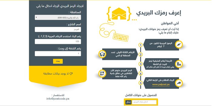 وأعلنت وزارة الاتصالات وتكنولوجيا المعلومات أنه أصبح بإمكان المواطن الحصول على رمزه البريدي للمبنى والمنطقة من خلال الموقع الالكتروني التالي: https://postcode.palestine.ps/