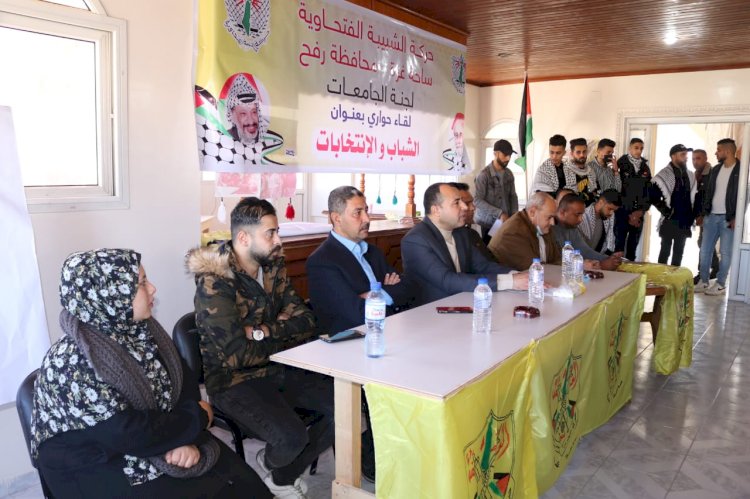 نظمت حركة الشبيبة الفتحاوية محافظة رفح لجنة الجامعات لقاء بعنوان (الشباب والانتخابات) بحضور الدكتور أحمد حسني آمين سر محافظة رفح و ناصر الحنفي آمين سر المجلس التنظيمي محافظة رفح و حنفي ابو سعدة عضو لجنة التعبئة الفكرية ساحة غزة آمين ابو هلال آمين سر حركة الشبيبة الفتحاوية بالمحافظة.