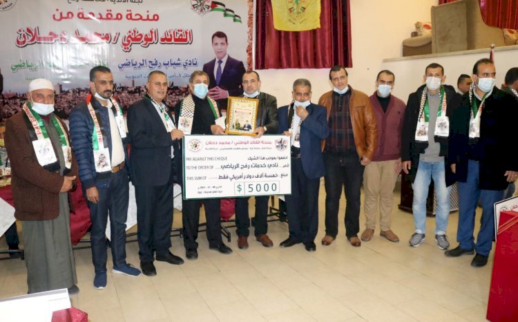 - قدم تيار الإصلاح الديمقراطي في حركة فتح منحة النائب محمد دحلان لتكريم أندية الخدمات والشباب في رفح في مطلع عام 2021.