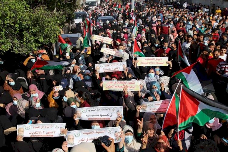 نظم تيار الإصلاح الديمقراطى فى حركة فتح، اليوم الخميس، مسيرة حاشدة رافضة لقرار تأجيل الإنتخابات التشريعية، في محافظة خانيونس.