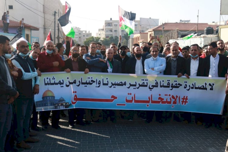نظم تيار الإصلاح الديمقراطي لحركة فتح بمحافظة الشمال اليوم الخميس، الموافق 29/4 2021م، مسيرة حاشدة رفضاً لقرار تأجيل الانتخابات التشريعية وقفة أمام مقر لجنة الانتخابات بالمحافظة.