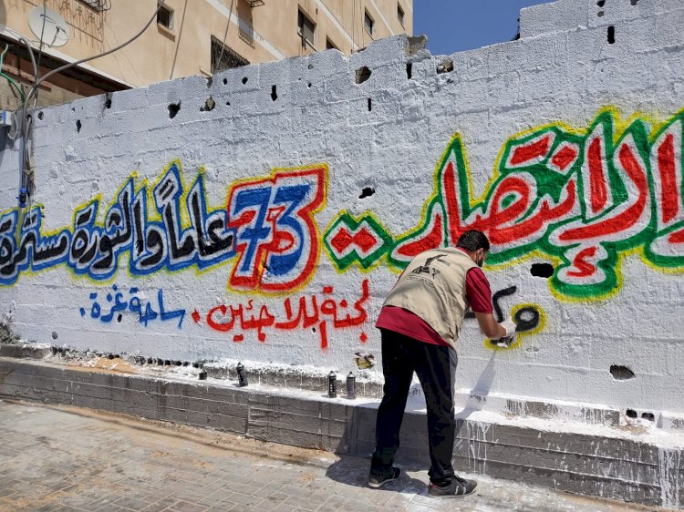 أحيت لجنة المؤسسات والمجتمع المدني ..لجنة اللاجئين ذكرى النكبة 73 في جميع مخيمات قطاع غزة برسم جداريات مركزية في مخيمات العزة والصمود .