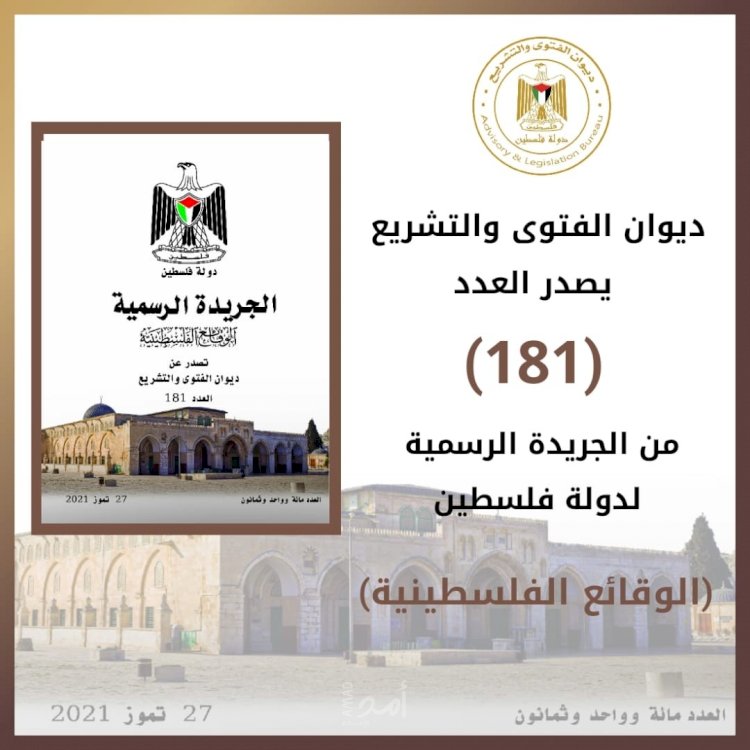 أصدر ديوان الفتوى والتشريع العدد (181) من الجريدة الرسمية "الوقائع الفلسطينية"،يوم الثلاء، مجموعة من القرارات.