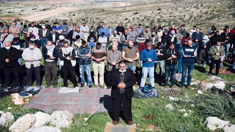 أدى عشرات المواطنين في مسافر يطا، صلاة الجمعة، في أراضيهم المهددة بالاستيلاء عليها في منطقة مسافر يطا جنوب الخليل.