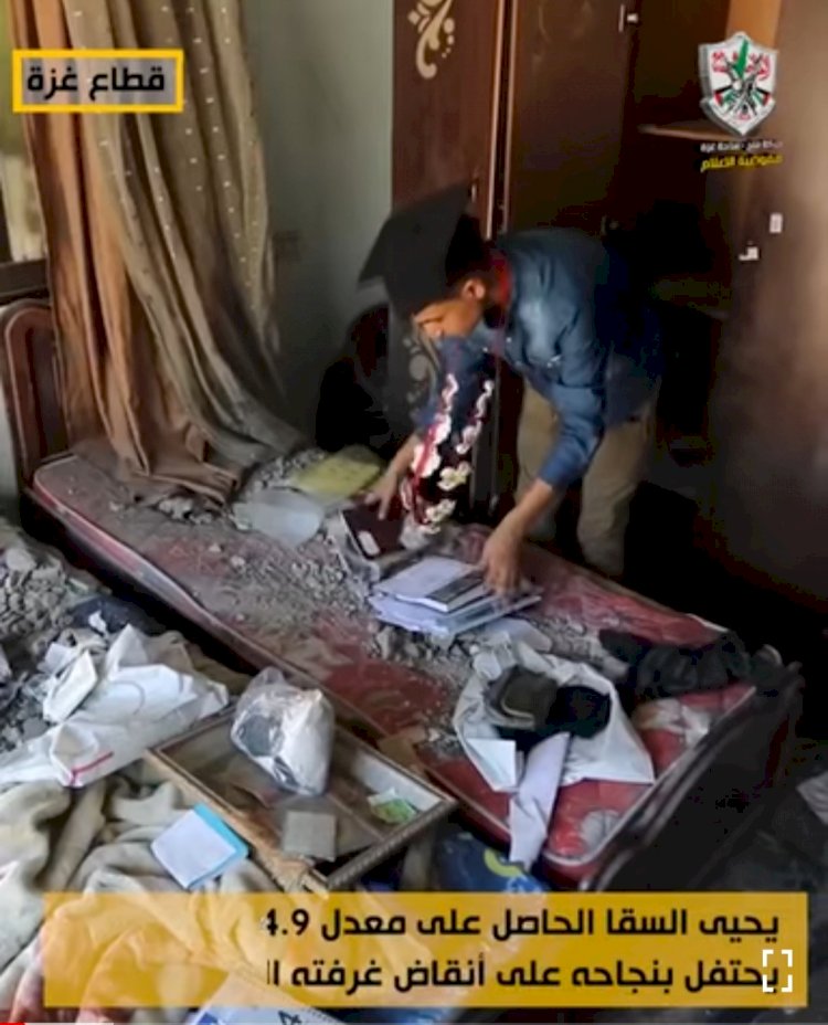 الطالب السقا الحاصل على معدل 94.9 يحتفل بنجاحه على أنقاض غرفته المدمرة