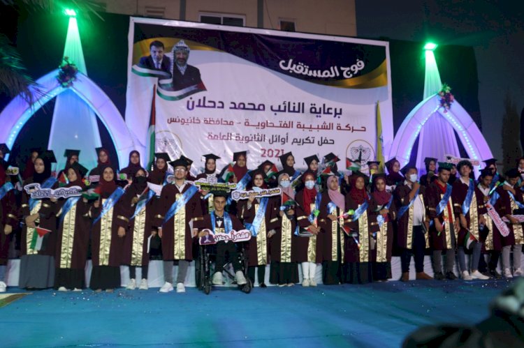 -حركة الشبيبة الفتحاوية في محافظة خانيونس تنظم حفلًا لتكريم متفوقي طلبة الثانوية العامة برعاية النائب محمد دحلان.
