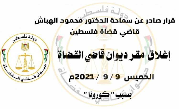أصدر قاضي قضاة فلسطين، محمود الهباش، قراراً بإغلاق مقر ديوان قاضي القضاة في مدينة رام الله، اليوم الخميس، بسبب إصابة أحد العاملين بفيروس كورونا.