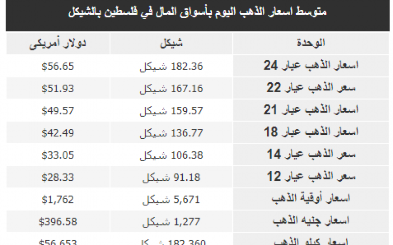 سجلت أسعار الذهب في أسواق فلسطين، اليوم الاثنين، وفقًا للشيكل الإسرائيلي والدولار، على النحو التالي: