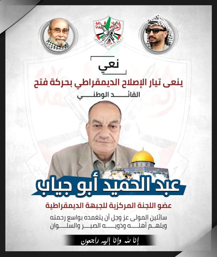 نعى تيار الإصلاح الديمقراطي في حركة فتح القائد الوطني عبد الحميد محمد أبو جياب "أبو فارس" عضو اللجنة المركزية للجبـهة الديمقراطية لتحـرير فلسطين.