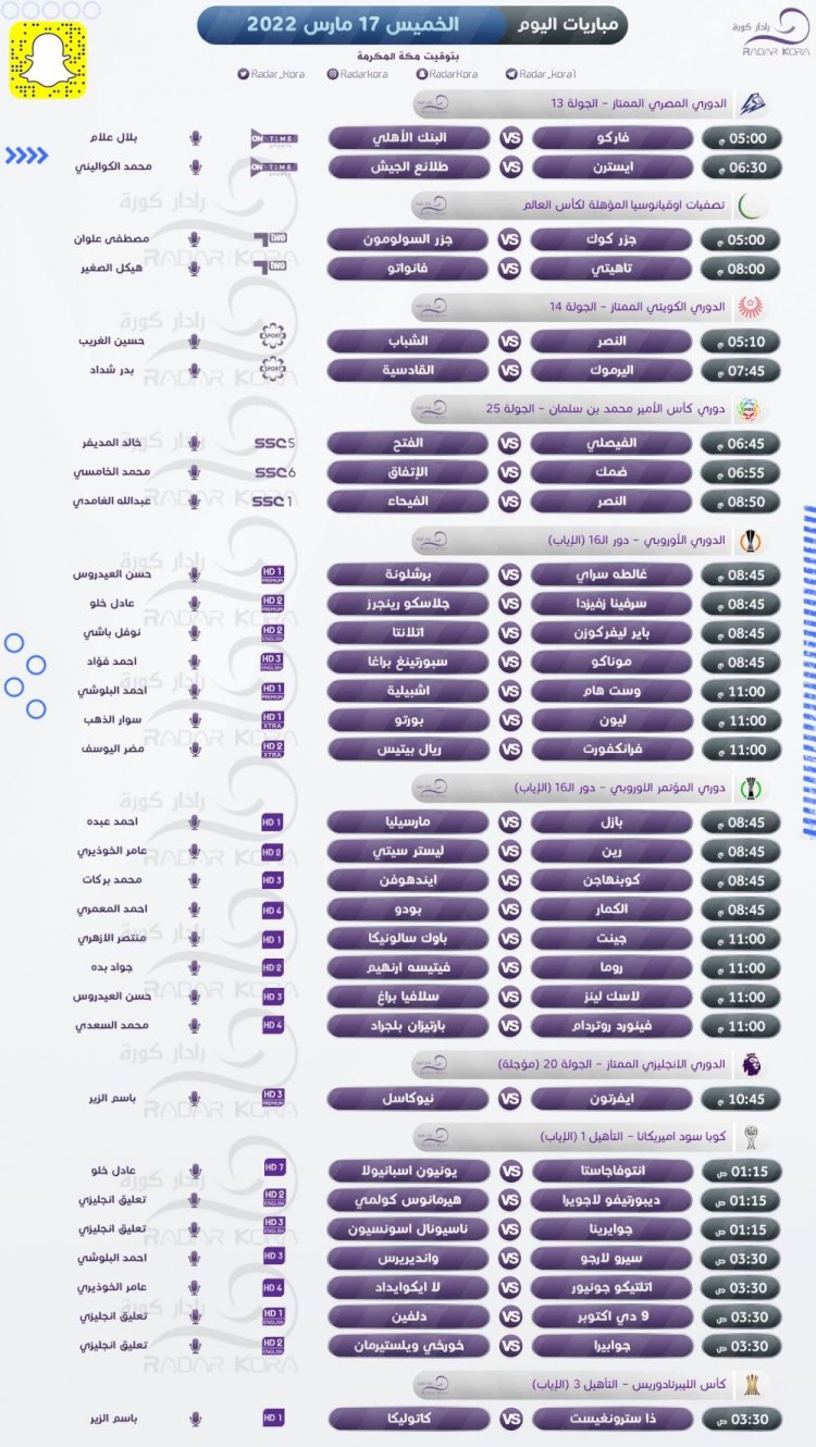 جدول أبرز مباريات الخميس بالبطولات والدوريات الأوروبية
