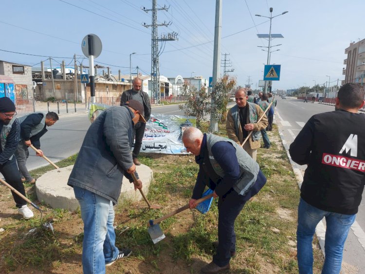 مجلس العمال وبلدية المغازي ينفذان يومًا تطوعيًا لتنظيف الشارع الرئيسي لمخيم المغازي