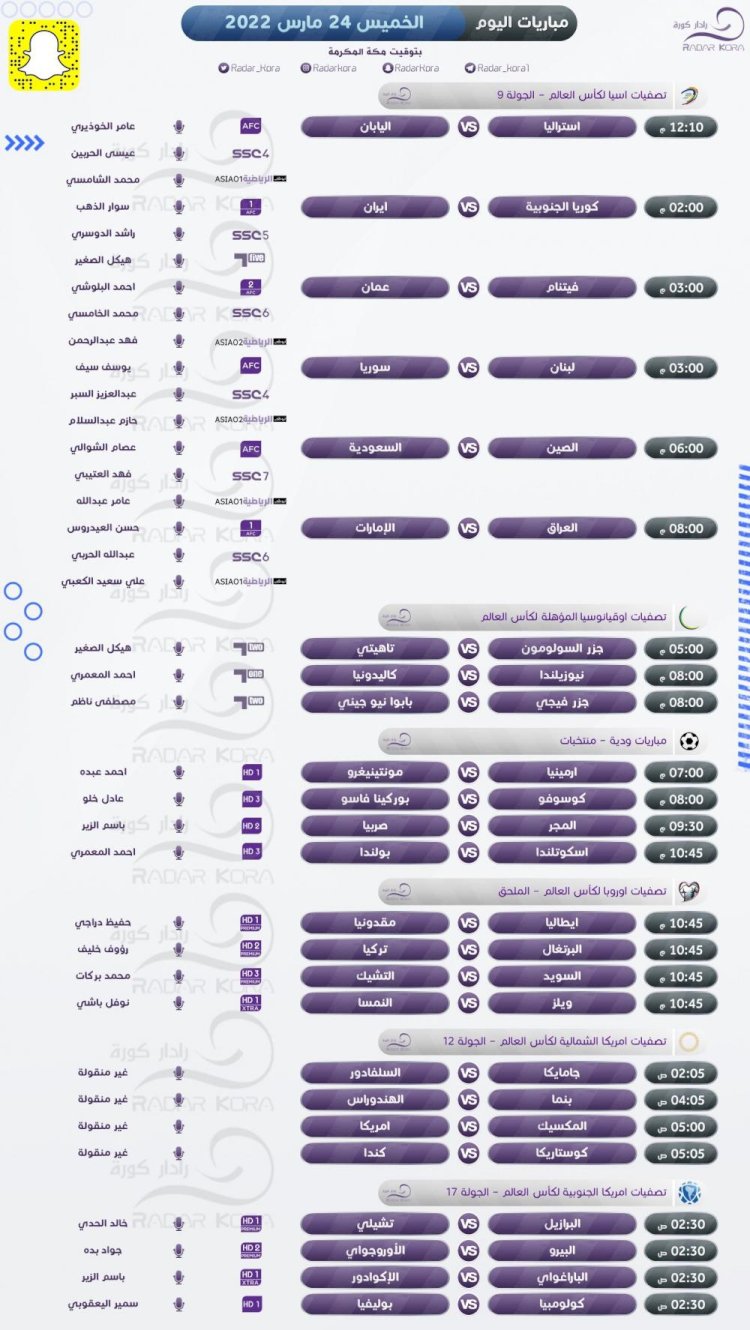 غزة -فتح ميديا:تتجه أنظار عشاق كرة القدم اليوم الخميس للعديد من المباريات القوية في التصفيات المؤهلة لكأس العالم بكرة القدم 2022 في قطر بمختلف القارات.