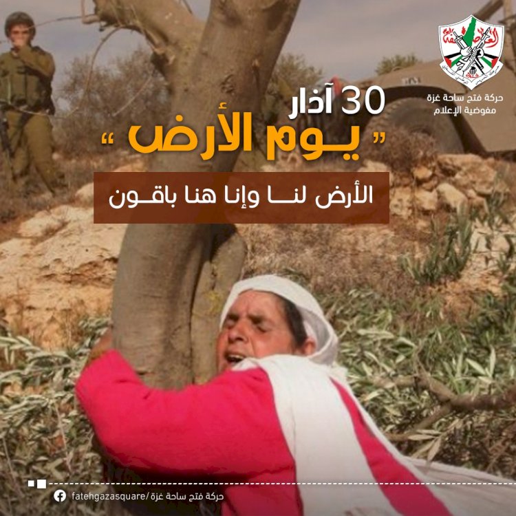 أكدت حركة فتح بساحة غزة، أن شعبنا الفلسطيني يحيي في الثلاثين من مارس من كل عام، في الداخل والشتات ذكرى يوم الأرض الخالد، والذي تعود أحداثه إلى عام ،1976 حيث بدأت أول مواجهة مباشرة بين شعبنا الفلسطيني من جهة، والمؤسسة العسكرية والسياسية الإسرائيلية منذ عام 1948م، حيث نتج عن هذه المواجهات مع المحتل ارتقاء ستة من الشهداء الأبطال بالإضافة إلى 49 جريحًا وأكثر من 300 معتقل.