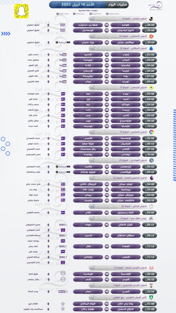 تتجه أنظار عشاق كرة القدم اليوم الأحد لعدة مباريات مهمة في الدوريات الأوروبية المختلفة، وأبطال أسيا.