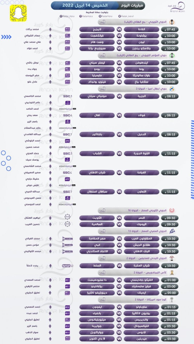 غزة - فتح ميديا:تتجه أنظار عشاق كرة القدم اليوم الخميس لمباريات إياب الدور ربع النهائي من الدوري الأوروبي، ودوري المؤتمر الأوروبي، ومرحلة المجموعات من دوري أبطال أسيا.