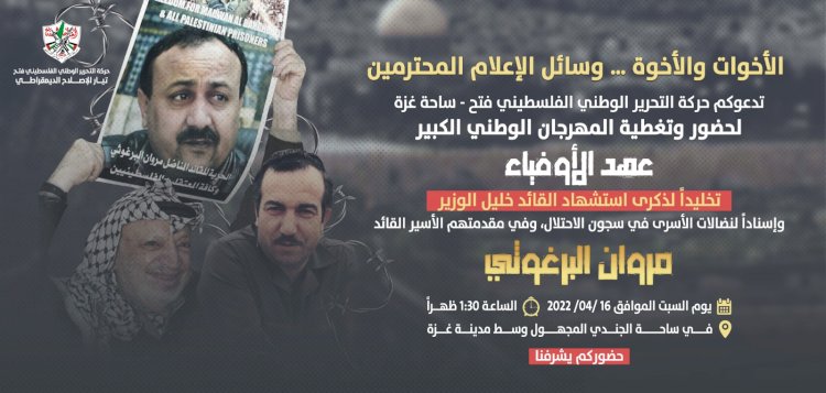 دعت حركة التحرير الوطني الفلسطيني - فتح بساحة غزة، جماهير شعبنا المناضل وفصائل العمل الوطني، وفي مقدمتهم كوادر وأعضاء وأنصار الحركة بساحة غزة، للمشاركة في المهرجان الجماهيري الحاشد "عهد الأوفياء"، والذي تنظمه في تمام الساعة الثانية بعد ظهر يوم السبت القادم الموافق 16/4/2022 في ساحة الجندي المجهول بمحافظة غزة؛ وفاءً لشهداء شعبنا وإحياءً للذكرى ال 34 لاستشهاد القائد خليل الوزير، ودعماً وإسناداً للأسرى البواسل في سجون الاحتلال وفي مقدمتهم القائد مروان البرغوثي؛ بمرور 20 عاماً على اعتقاله.