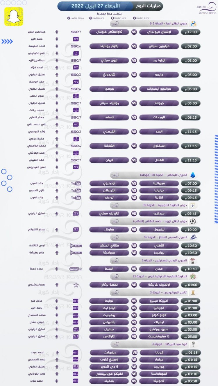 جدول أبرز مباريات الأربعاء في البطولات المختلفة