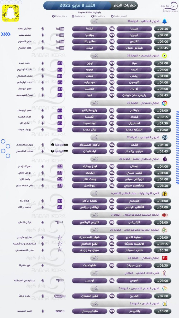 غزة - فتح ميديا:تتجه أنظار عشاق كرة القدم اليوم الأحد لعدة مباريات في الدوريات الأوروبية المختلفة، والكونفدرالية الإفريقية.