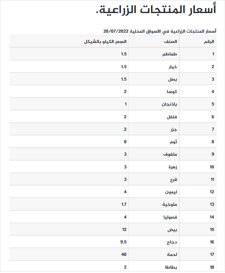 إليكم متوسط أسعار المنتجات الزراعية بالشيكل كما أعلنتها وزارة الزراعة في غزة: