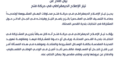 أدان تيار الإصلاح الديمقراطي في حركة فتح محاولات البعض المشبوهة (وتحديداً جماعة التنسيق الأمني المقدس) بالزج باسم التيار وقيادته في الجدل الدائر حول المشاركة في انتخابات بلدية القدس المحتلة.