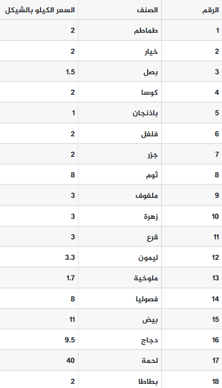 جاءت أسعار الخضروات واللحوم في أسواق قطاع غزة، اليوم الثلاثاء 2/8/2022، كما أعلنتها وزارة الزراعة، على النحو التالي: