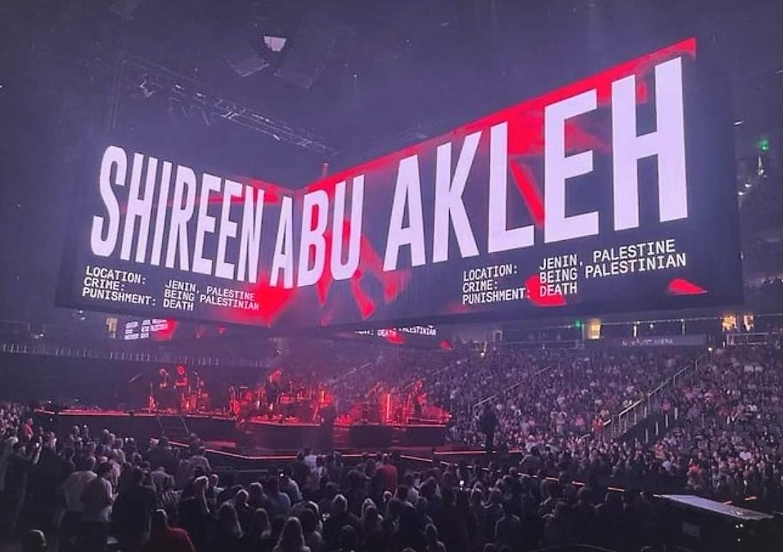 وضعت فرقة بينك فلويد، اسم الشهيدة شيرين أبو عاقلة على شاشة عرض ضخمة خلال حفل أقامته في مدينة نيويورك، لمناسبة مرور مائة يوم على استشهادها.