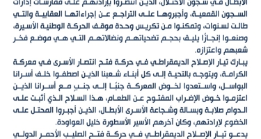 توجه تيار الإصلاح الديمقراطي في حركة فتح بتحية إعزازٍ لأسرى شعبنا الأبطال في سجون الاحتلال، الذين انتصروا بإرادتهم على ممارسات إدارات السجون القمعية، وأجبروها على التراجع عن إجراءاتها العقابية والتي طالت لسنوات، وتمكنوا من تكريس وحدة موقف الحركة الوطنية الأسيرة، وصنعوا إنجازًا يليق بحجم تضحياتهم ونضالاتهم التي هي موضع فخر شعبهم واعتزازه.