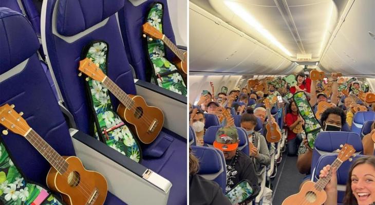 ليس كل يوم تصعد على متن رحلة لتجد جيتارًا على مقعدك وشخص مستعد لإعطائك دروسًا فى الجو، لكن هذا بالضبط ما حدث لأولئك الذين كانوا على متن خطوط ساوث ويست إيرلاينز الأمريكية، مع انتشار المفاجأة الغريبة بعد أن شاركتها شركة الطيران في تغريدة، حيث شاركت شركة الطيران صورة لطائرة مليئة بالركاب المبتسمين الذين كانوا متجهين من لونج بيتش، كاليفورنيا، إلى هاواى، حاملين القيثارة المجانية التى وجدوها على مقعدهم مع حقيبة زهرية.