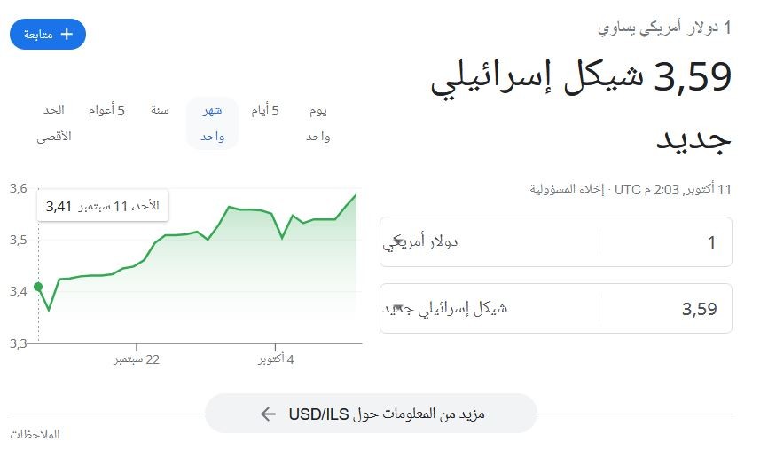 وسجل سعر صرف الدولار الآن أمام الشيكل الإسرائيلي 3.59 شيكل.
