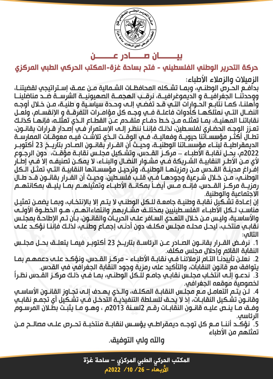 المكتب الحركي الطبي المركزي في حركة فتح بساحة غزة يرفض قرار الرئيس بحل نقابة الأطباء