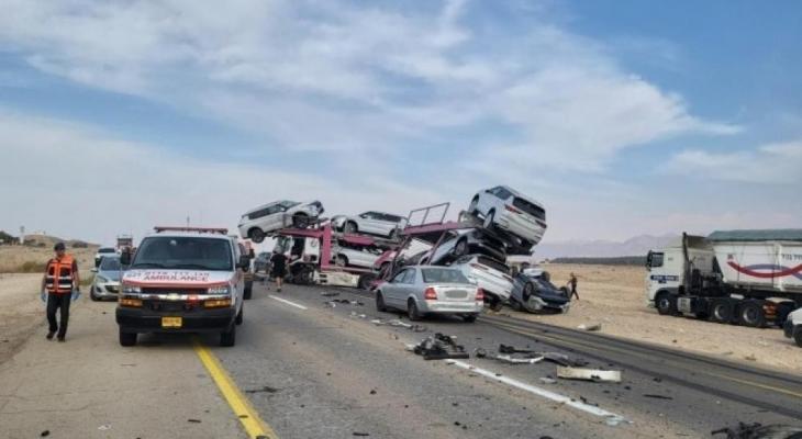 لقي رجل وامرأة مصرعيهما مساء يوم الإثنين، في حادث طرق وقع بين شاحنة لنقل المركبات وسيارتين خصوصيتين على شارع 90 في منطقة النقب.