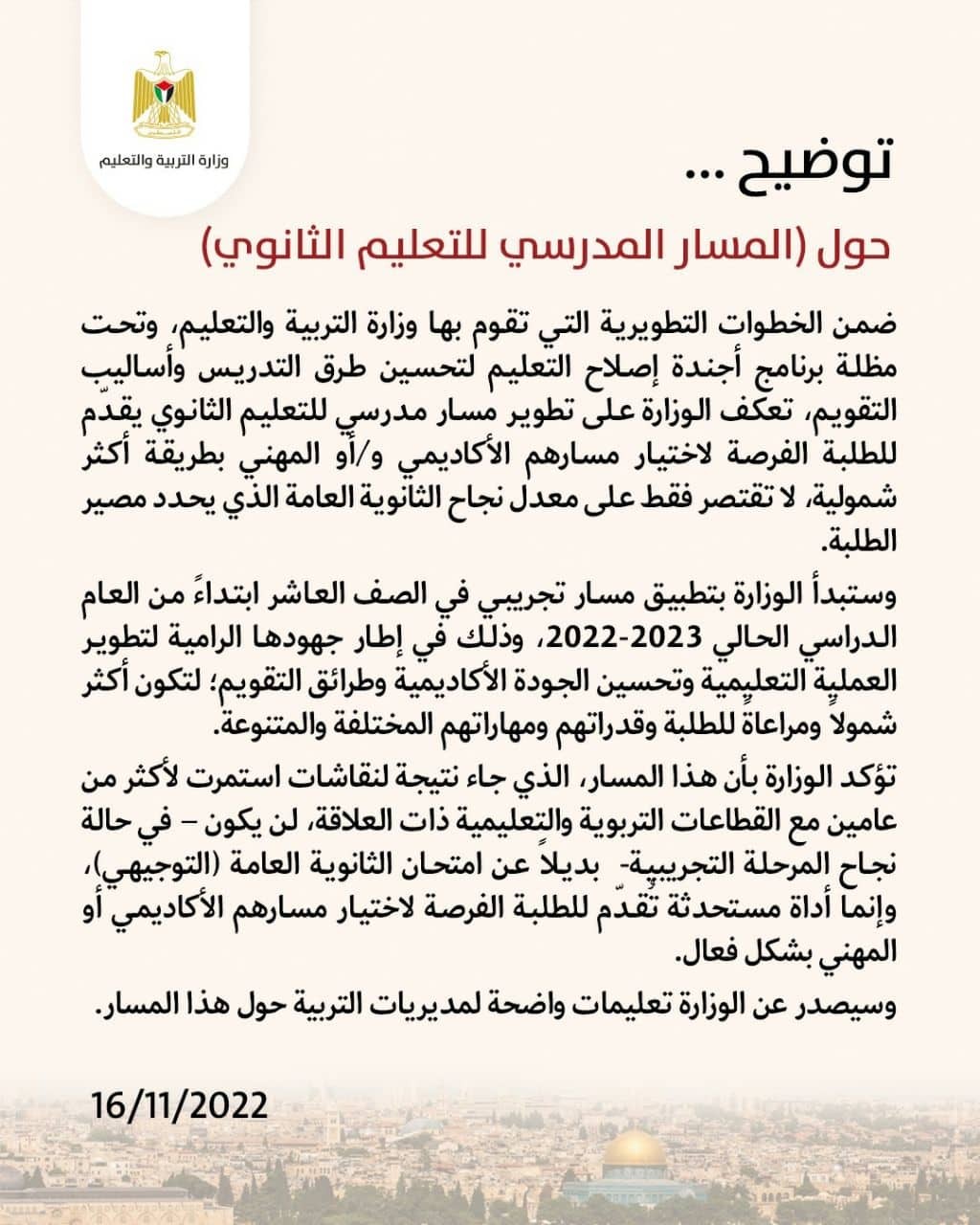 أصدرت وزارة التربية والتعليم، مساء يوم الأربعاء، توضيحًا حول المسار المدرسي للتعليم الثانوي.
