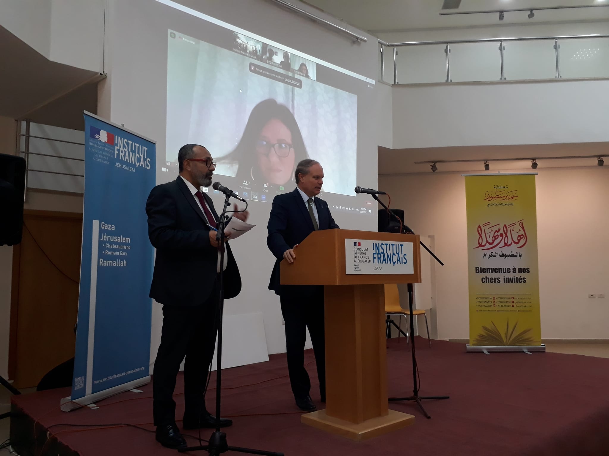 واستمع الحضور لكلمة بلدية مونتري عبر تقنية زووم الذي أكد على استمرار الدعم والتعاون مع الجهات الثقافية الفلسطينية وخصوصاً ما يتعلق بالطباعة والنشر والتوزيع الدولي للإنتاج الأدبي الفلسطيني
