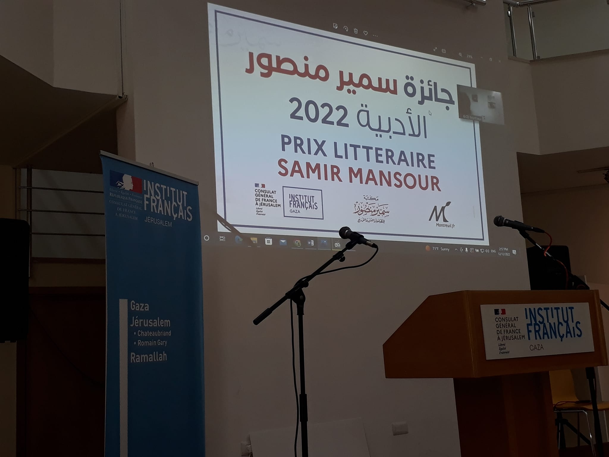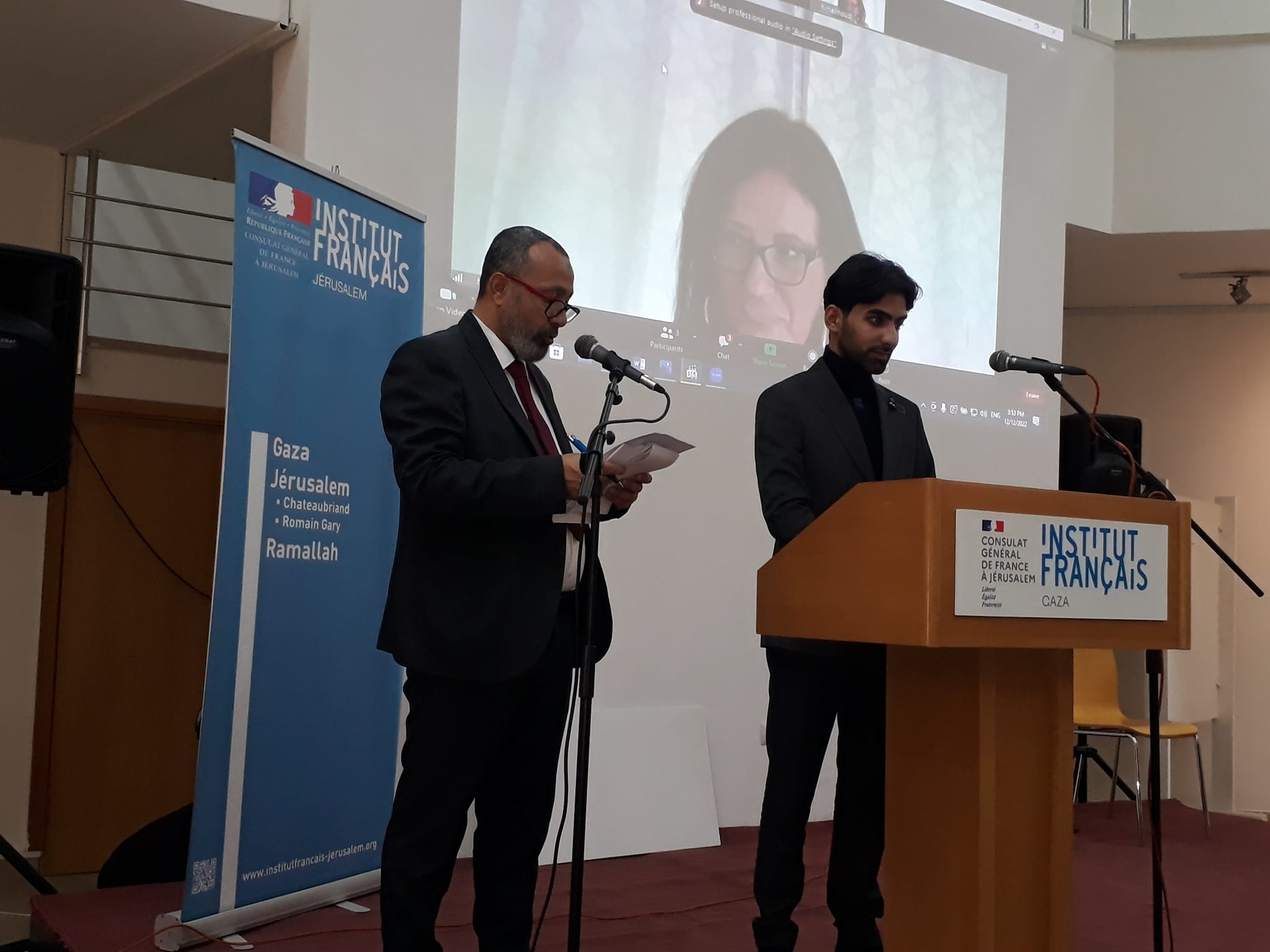حيث أقام المعهد الثقافي الفرنسي في غزة حفل توزيع الجوائز بحضور أساتذة الأدب من جامعة الأقصى وجامعة الأزهر و رؤساء المراكز الثقافية وعدد من الكتاب والمثقفين و أصحاب دور النشر المحلية.