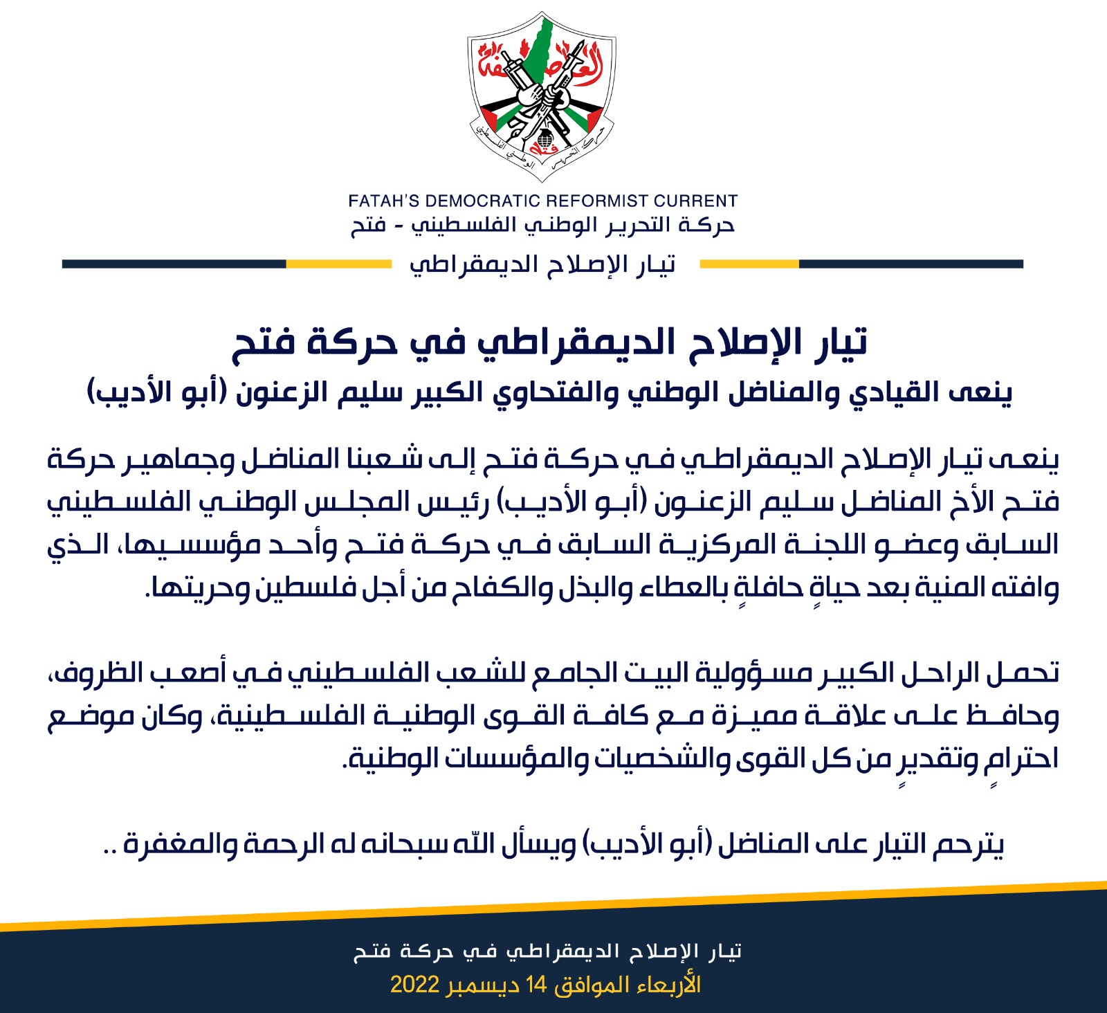 تيار الإصلاح الديمقراطي في حركة فتح ينعى المناضل الوطني الكبير "سليم الزعنون"