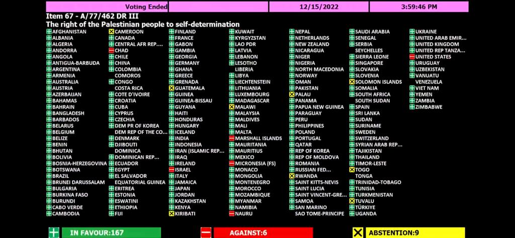 اعتمدت الجمعية العامة للأمم المتحدة، بأغلبية ساحقا، مساء أمس، قرار حق الشعب الفلسطيني في تقرير مصيره.