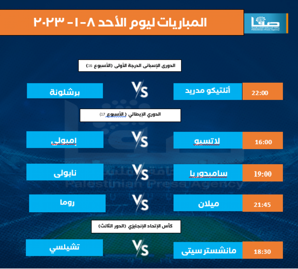 تتجه أنظار عشاق كرة القدم اليوم الأحد لعدة مباريات في الدوريات الأوروبية المختلفة "الإسباني، والإيطالي"، وكأس الاتحاد الإنجليزي.