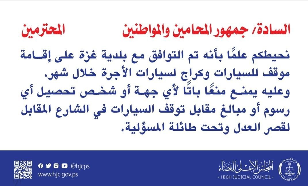 أصدر المجلس الأعلى للقضاء في غزة، مساء يوم الثلاثاء، تنويهًا إلى المحامين والمواطنين، بشأن إقامة موقف للسيارات، وكراج لسيارات الأجرة.