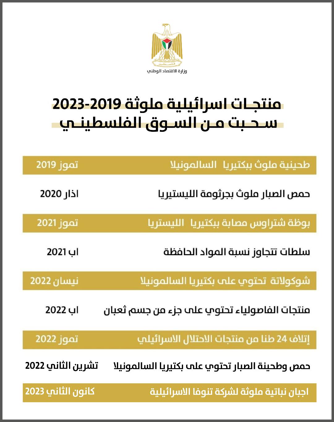 يذكر أن وزارة الاقتصاد سحبت بين الأعوام 2019-2023 عددا من المنتجات الإسرائيلية الملوثة تشكل خطرا على صحة وسلامة المواطنين بعضها يحتوي على بكتيريا السالمونيلا وجرثومة الليستيريا وأخرى تحتوي على جزء من جسم ثعبان وملوثة أثناء عملية التصنيع.