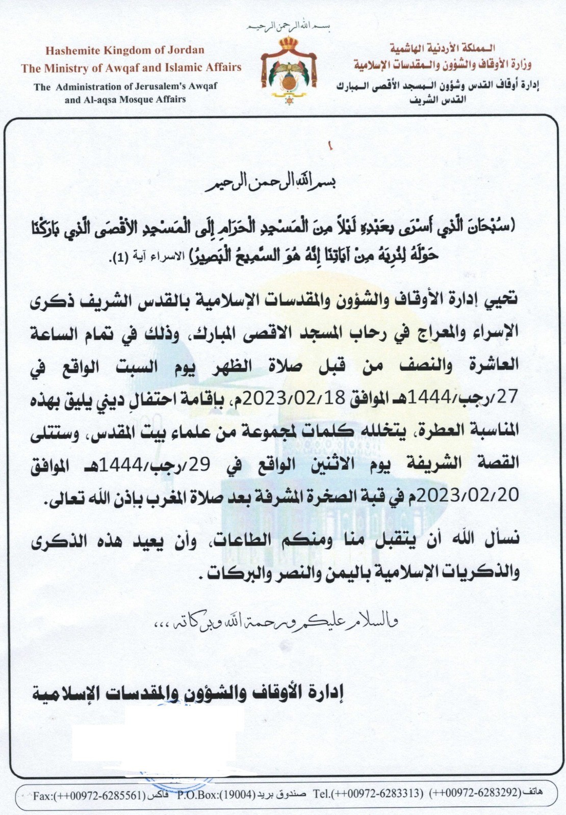 أعلنت إدارة أوقاف القدس وشؤون المسجد الأقصى، التابعة لوزارة الأوقاف والشؤون والمقدسات الإسلامية في الأردن، اليوم الإثنين، موعد إحياء ذكرى الإسراء والمعراج في رحاب المسجد الأقصى.