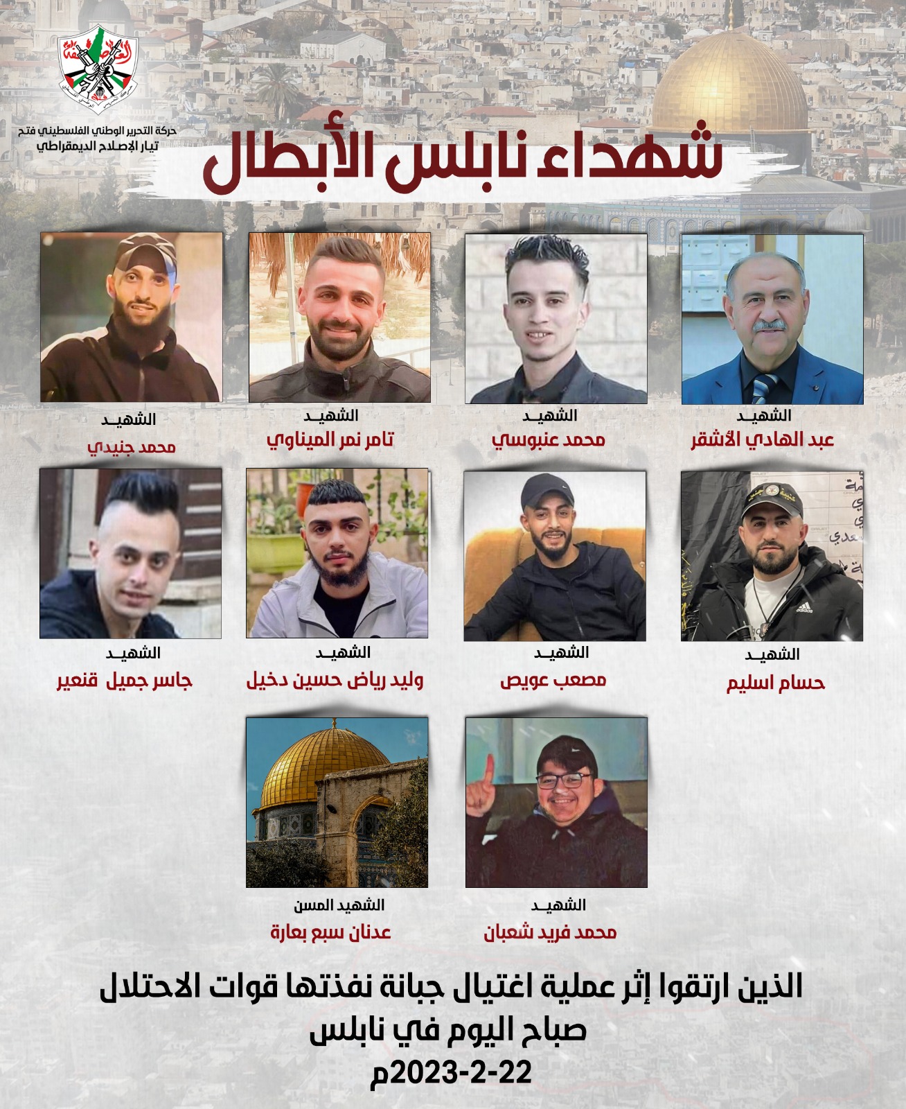 وأوضحت وزارة الصحة في بيان مقتضب، أن أسماء الشهداء هم الشهيد المسن عدنان سبع بعارة (٧٢ عاماً) والشهيد محمد خالد عنبوسي (٢٥ عاماً) والشهيد تامر نمر أحمد ميناوي (٣٣ عاماً) والشهيد مصعب منير محمد عويص (٢٦ عاماً) والشهيد حسام بسام اسليم (٢٤ عاماً) والشهيد محمد عمر أبو بكر (٢٣ عاماً) والشهيد وليد رياض حسين دخيل ( ٢٣ عاماً) والشهيد المسن عبد الهادي عبد العزيز أشقر ( ٦١ عاماً ) والشهيد الطفل محمد فريد شعبان (16 عامًا) والشهيد جاسر جميل عبد الوهاب قنعير ( ٢٣ عاماً )، وقد استشهدوا متأثرين بجروحهم برصاص الاحتلال.