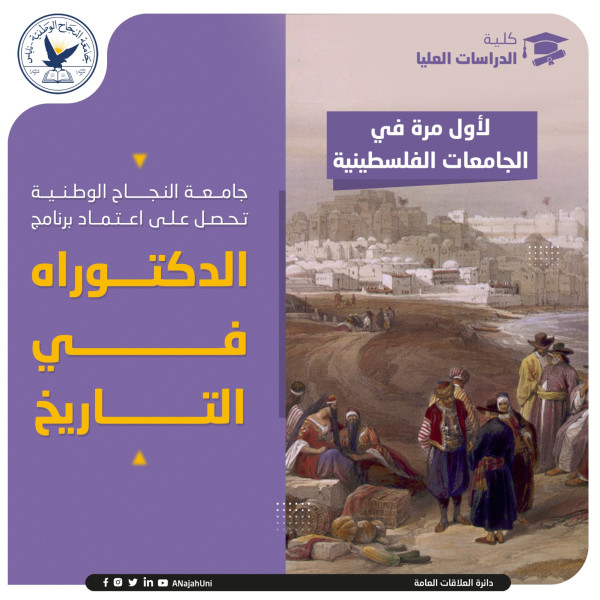 تأكيداً لرسالتها في الحفاظ على الهوية الفلسطينية وتوثيق تاريخ فلسطين عبر العصور، حصلت جامعة النجاح الوطنية على اعتماد الهيئة الوطنية للاعتماد والجودة النوعية في وزارة التعليم العالي والبحث العلمي لبرنامج دكتوراه في التاريخ.